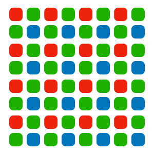 Różne kolory filtrów dla każdego z pikseli ułożone są w odpowiedni wzór, ułożenie filtrów wygląda w taki sposób, że połowa powierzchni stanowi filtr koloru zielonego, a pozostała połowa podzielono jest po równo między kolory czerwony i niebieski. Takie ułożenie wynika bezpośrednio z percepcja siatkówki ludzkiego oka, które najbardziej czułe jest właśnie na kolor zielony.