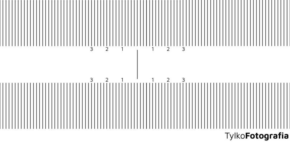 Karta testowa składa się z umieszczonej w środku linii, na którą będziemy ostrzyć oraz podziałek które znajdują się po obydwu jej stronach. Na podziałkach zaznaczone są trzy linie symbolizujące odpowiednio 1, 2 oraz 3 centymetry w przód oraz tył od linii autofocusa – tej na którą w trakcie pomiaru będziemy ustawiać ostrość.