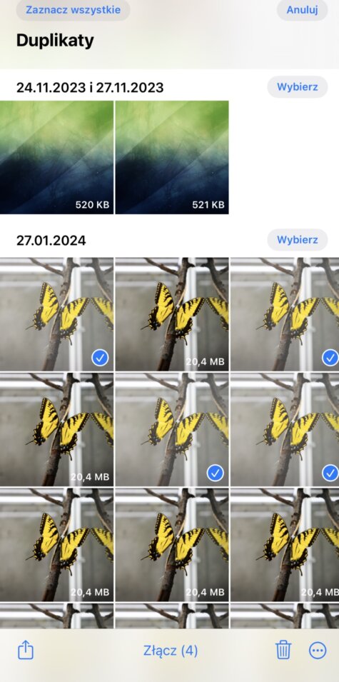 W kolejnym kroku możemy skorzystać z opcji Złącz lub Wybierz. W przypadku skorzystania z opcji Złącz widocznej nad grupą duplikatów wszystkie duplikaty zostaną połączone w jedno zdjęcie. Druga możliwość to skorzystanie z opcji Wybierz znajdującej się w górnej części menu, możemy wtedy wybrać zdjęcia do połączenia.