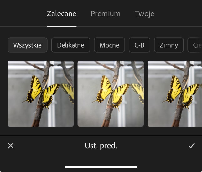 Jeżeli nie jesteśmy w stanie poradzić sobie samodzielnie z korekcją zdjęcia możemy skorzystać z Ustawień predefiniowanych które są niczym innym jak Presetami. Istotną różnicą pomiędzy Programami Lightroom Classic a Lightroom jest funkcja automatycznego dobierania presetu do danego zdjęcia. Jeśli klikniemy w ustawienia predefiniowane sztuczna inteligencja Adobe Sensei przeanalizuje zdjęcie a następnie zaproponuje kilka presetów ze swojej bogatej biblioteki. Możemy tutaj również wybrać intensywność presetu czy jego kolorystykę.
