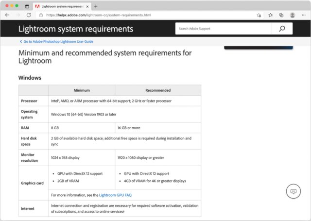 Jak widać na powyższym zrzucie ekranu, wymagania są na tyle niskie, że każdy współczesny komputer bez problemu zostanie zakwalifikowany jako odpowiedni do programu Lightroom Classic.