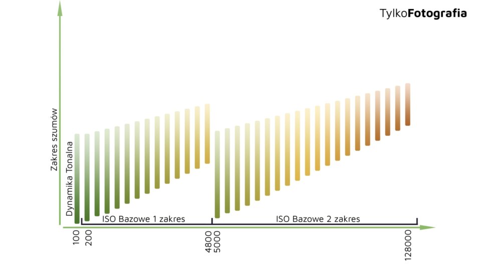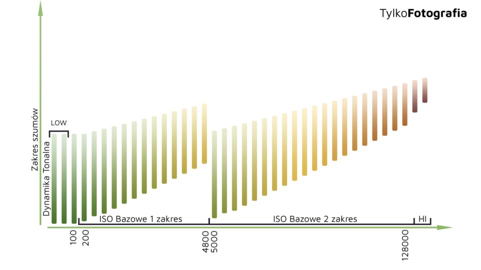 Jest to wartość czułości ISO, która jest realizowana poprzez wzmocnienie sygnału ze wspomnianych wcześniej fotodiod (ISO natywnego) przez wzmacniacze analogowe. I tak dla przykładu, jeśli w naszym aparacie ISO natywne wynosi 100 to aby uzyskać wartość ISO 200 sygnał musi być wzmocniony dwukrotnie. Analogicznie, aby uzyskać wartość ISO 400 sygnał musimy wzmocnić czterokrotnie. Wraz ze wzrostem wzmocnienia a co za tym idzie zwiększeniem wartości ISO maleje dynamika tonalna oraz rosną szumy, remedium na to podwójny zakres czułości ISO bazowego